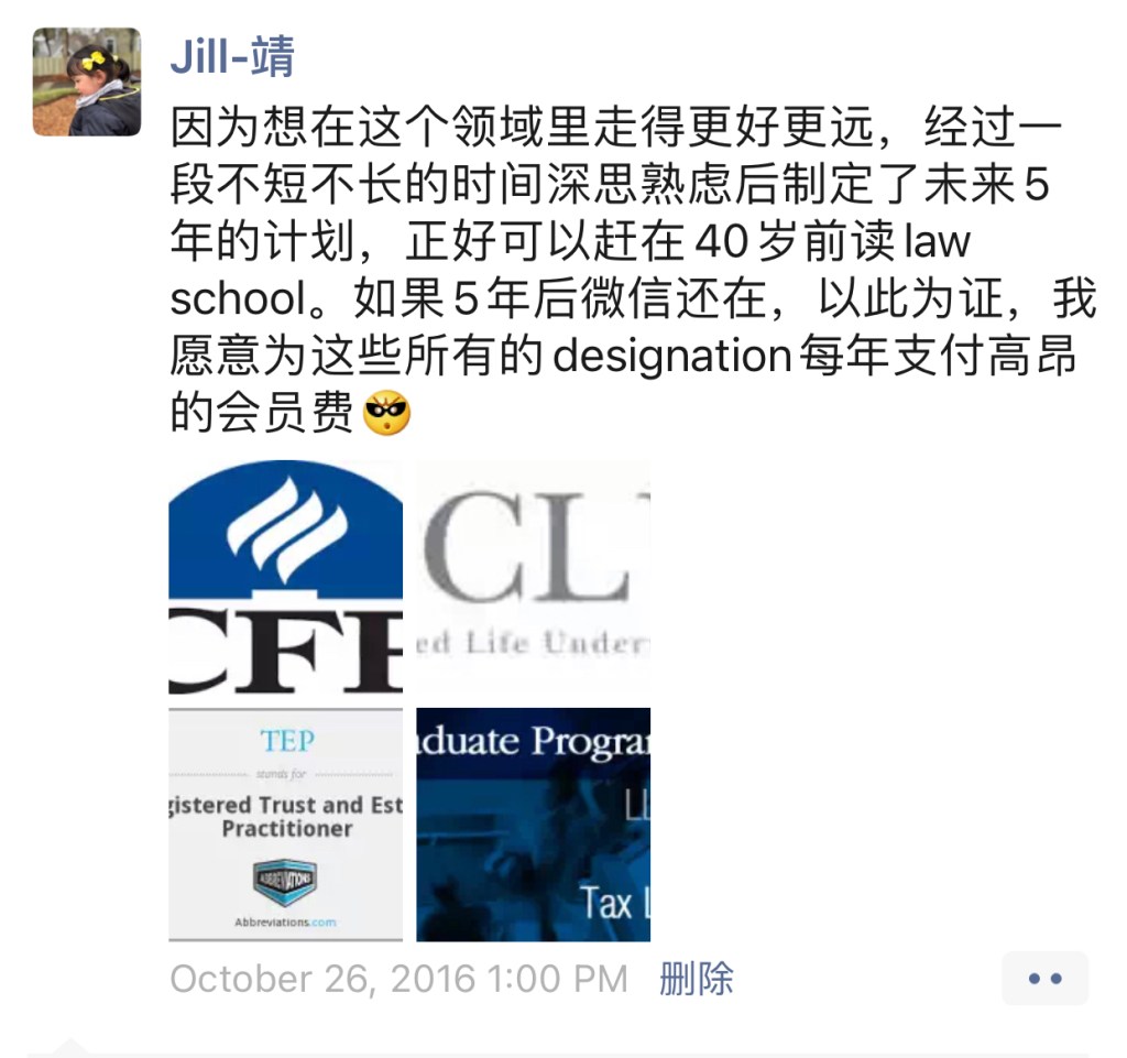 大家都知道,我这几年来一直都在读书考证,先是Certified Financial Planner (CFP) 注册财务规划师,接着是Chartered Life Underwriter (CLU) 注册人寿理财师,还有上个月刚考完最后一门在等成绩出来的Registered Trust and Estate Practitioner (TEP) 注册信托及资产规划师。